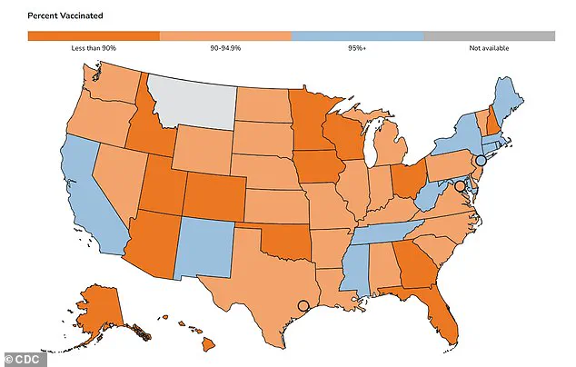The CDC has released a map highlighting MMR (measles, mumps, rubella) vaccination rates among kindergarteners in each state, revealing stark disparities.