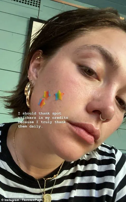 Actress Florence Pugh recently shared a photo on social media showing herself with three pimple patches on her face.