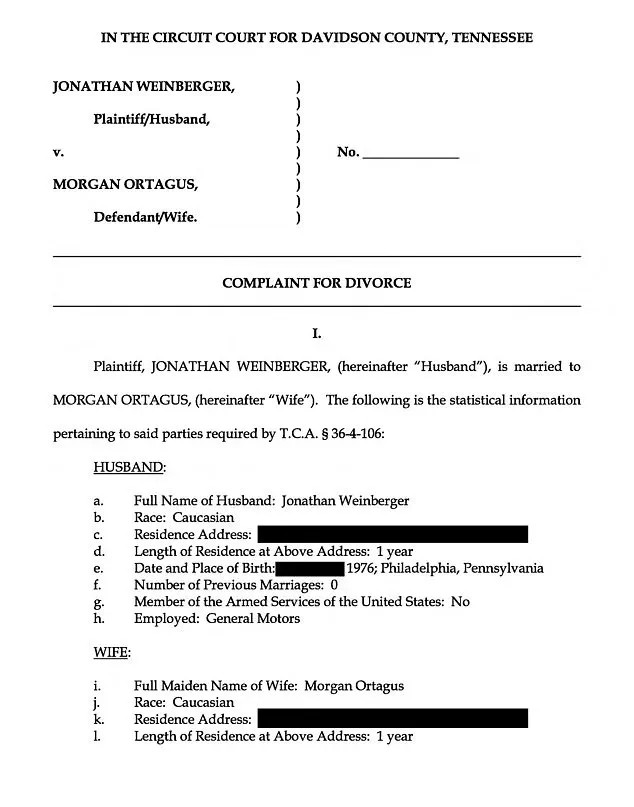 The divorce filing by Weinberger in Nashville, Tennessee, listed the date of separation as ‘date of filing,’ citing ‘irreconcilable differences.’ However, a source close to Ortagus clarified that the 12-year marriage had ended well before the November 4 petition was submitted.