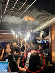 Footage shows her seated on a colleague’s shoulders, holding two champagne bottles fitted with sparklers—moments before the fire engulfed the club.