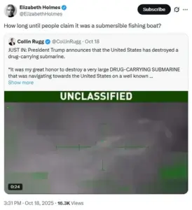 In October 2024, she responded to a tweet about a U.S. attack on a drug-smuggling vessel near Venezuela by questioning the narrative, writing, “How long until people claim it was a submersible fishing boat?” This comment, which some interpreted as a critique of the Trump administration’s foreign policy, was followed by a more conciliatory post in September, where she wrote, “Time to come together,” in response to a photo of Trump and Elon Musk sitting side by side after their public dispute.