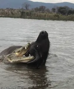 A buffalo, its massive frame bobbing above the water’s surface, found itself ensnared in a deadly embrace with a crocodile.