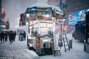 NEW YORK CITY—A man continued to work in a food cart amid the massive snow storm.